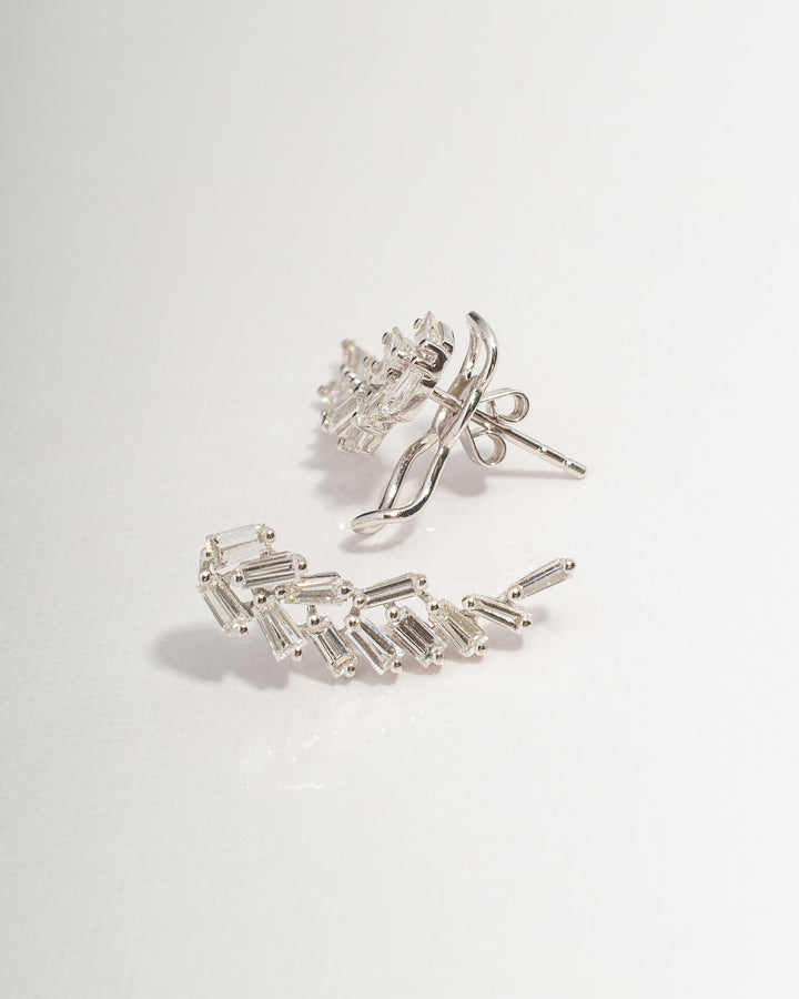 Elaborados en oro blanco de 18 quilates, su forma curva se adorna con una secuencia precisa de diamantes talla baguette, cuidadosamente engastados para reflejar la luz con una pureza excepcional.
