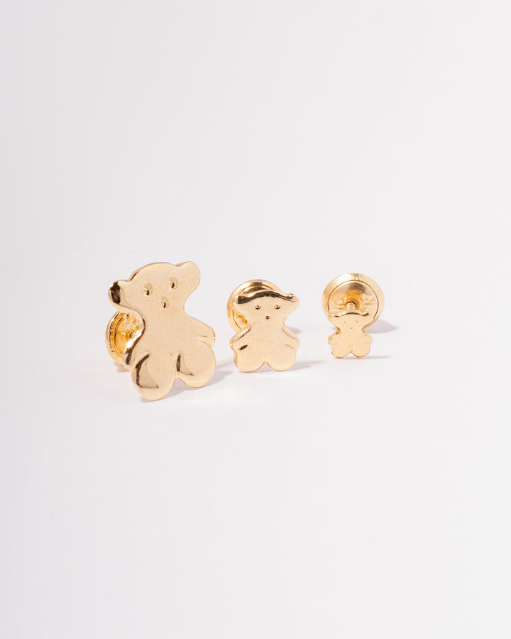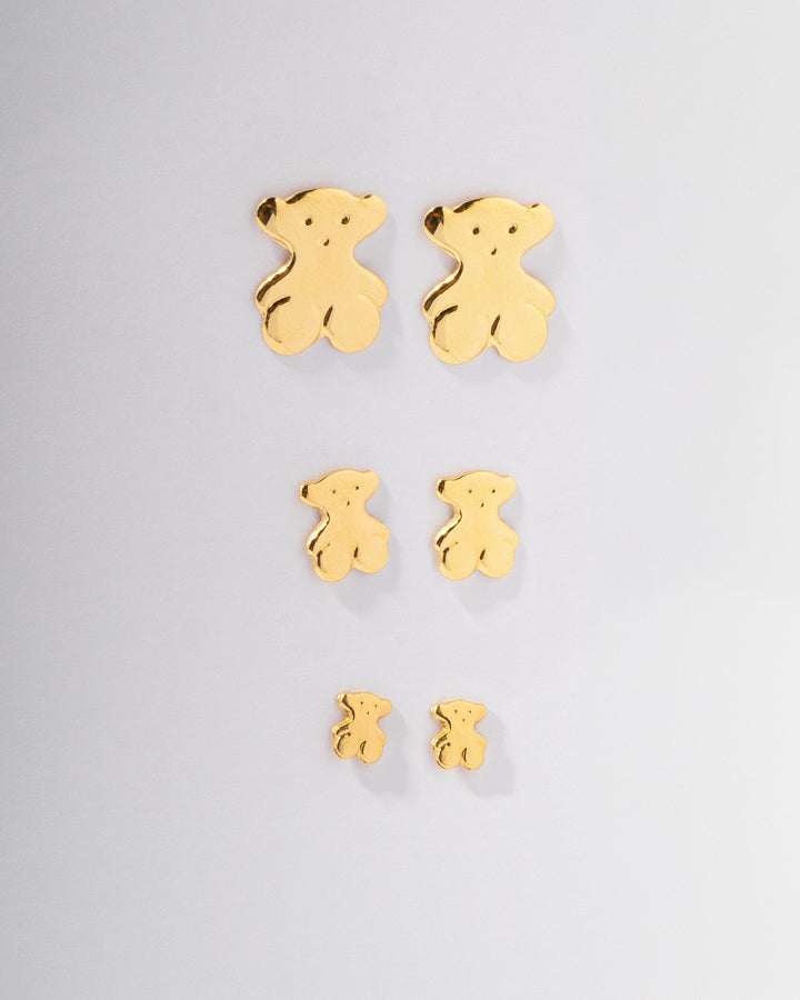 Topos en oro de 18K con diseño tipo oso, pulido a brillo espejo y acabado uniforme que refleja una luz suave y delicada. Un par minimalista, moderno y perfecto para uso diario.